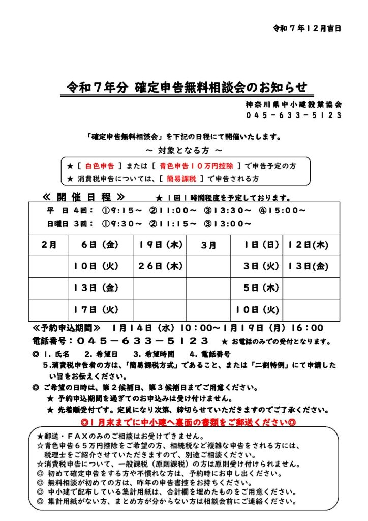 確定申告無料相談会のお知らせ 2025年12月22日 最終更新日時 : 2025年12月19日 chushoken 今年度も確定申告無料相談会を添付(2ページ)にある日程で行います。 対象者:★[白色申告]または[青色申告10万円控除]で申告予定の方 ★消費税申告については、[簡易課税]で申告される方 2割特例の概要 消費税及び地方消費税の確定申告の手引き 神奈川県中小建設業協会 TEL:045-633-5123